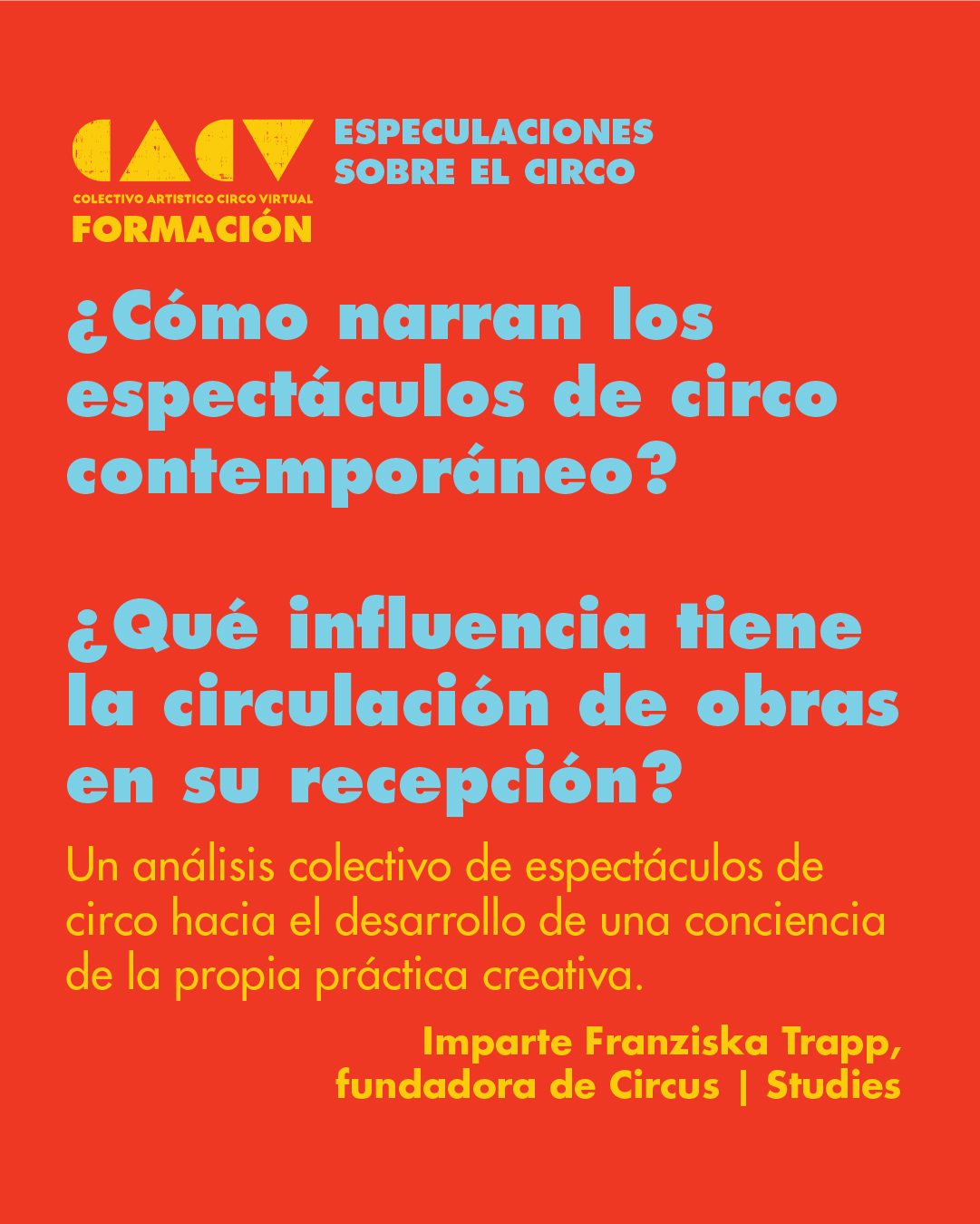 Las actividades estarán enfocadas en compartir diversas metodologías y aproximaciones para la investigación, creación, dirección y dramaturgia para el desarrollo del circo contemporáneo.