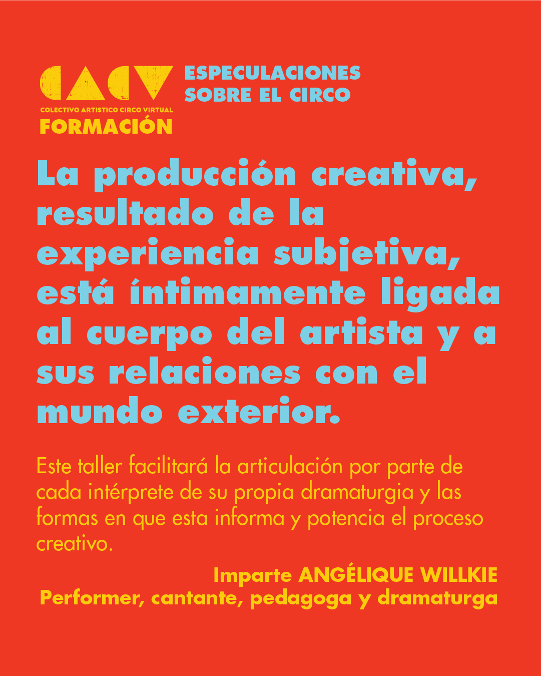 El arte del espectáculo es un espacio crucial para cuestionar las nociones de identidad y agencia. En la danza y el circo, estas individualidades han quedado a menudo enterradas bajo fantasías de homogeneización o neutralidad. Los cuerpos en escena importan. La producción creativa, resultado de la experiencia subjetiva vivida, está íntimamente ligada al cuerpo del artista y a sus relaciones con el mundo exterior. En lugar de considerar el cuerpo como una simple morfología, apariencia física o habilidad técnica, este taller facilitará la articulación por parte de cada intérprete de su propia dramaturgia personal, y explorará las formas en que esta dramaturgia informa y potencia el proceso creativo. Diversos modos, como lecturas, debates en grupo, diarios y exploraciones situacionales, ayudarán a los participantes a entender su cuerpo relacional como lienzo creativo.