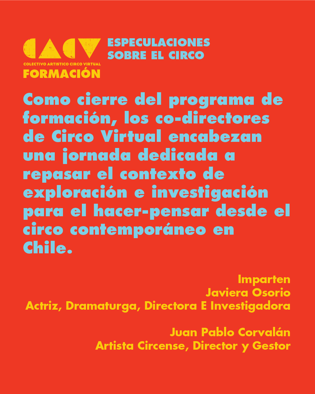 Es un proyecto de investigación para la creación desde el circo contemporáneo, creado por el Colectivo Artístico Circo Virtual, donde buscamos brindar un contexto de exploración e investigación teórica-práctica para el hacer-pensar desde el circo contemporáneo en Chile.